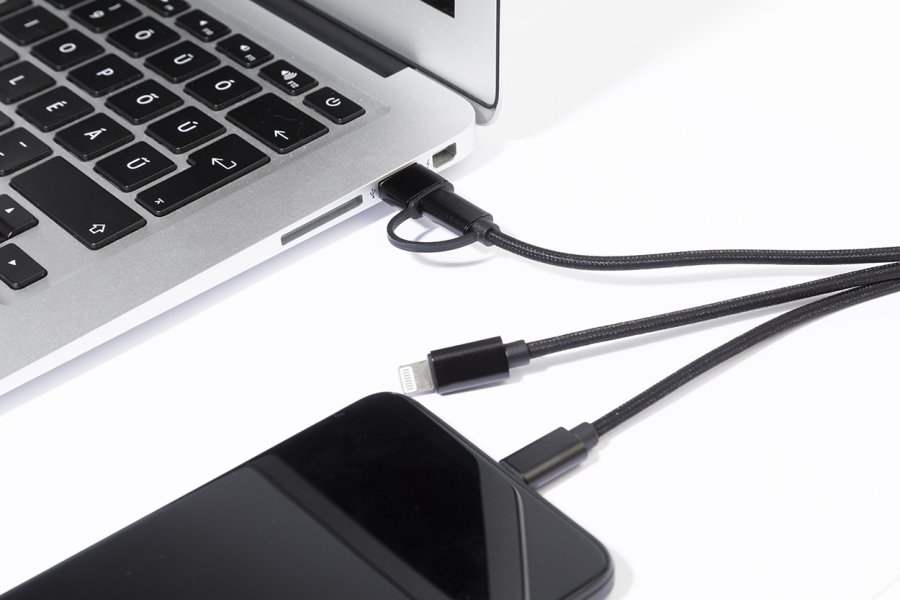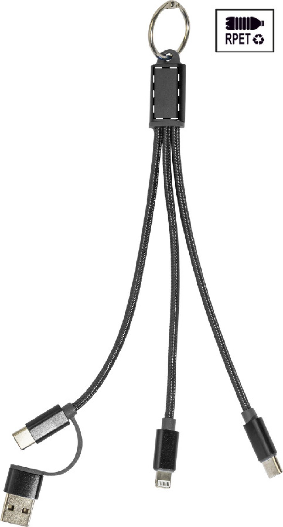 Nabíjecí kabel USB-C z recyklovaného hliníku a RPET s přívěskem na klíče. S konektory micro USB, USB-C a Lightning. S USB a USB-C vstupy.