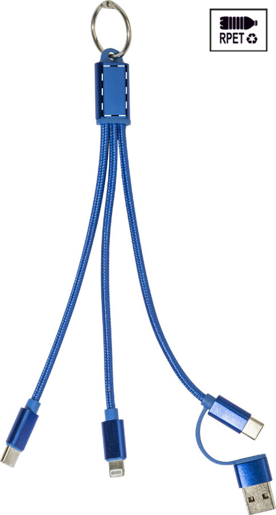 Nabíjecí kabel USB-C z recyklovaného hliníku a RPET s přívěskem na klíče. S konektory micro USB, USB-C a Lightning. S USB a USB-C vstupy.