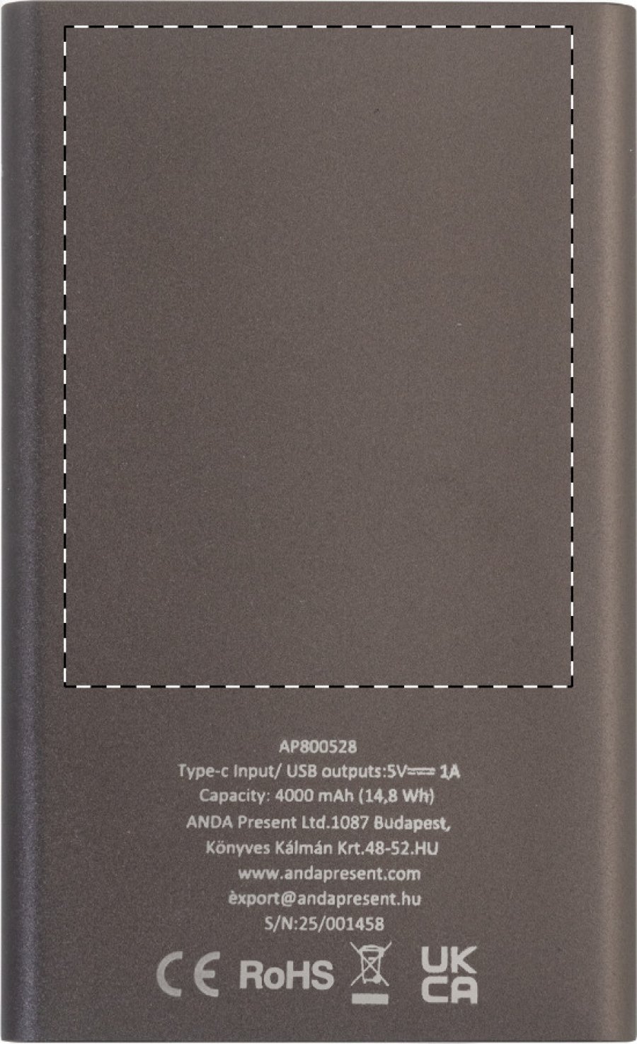 USB power banka v pouzdře z recyklovaného hliníku s 4000 mAh baterií. S 1 portem USB a 1 portem USB-C pro nabíječku. Vstupní port USB-C. Včetně USB nabíjecího kabelu.
