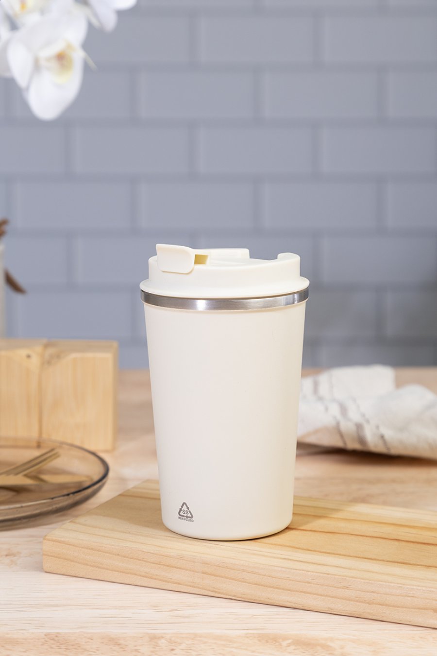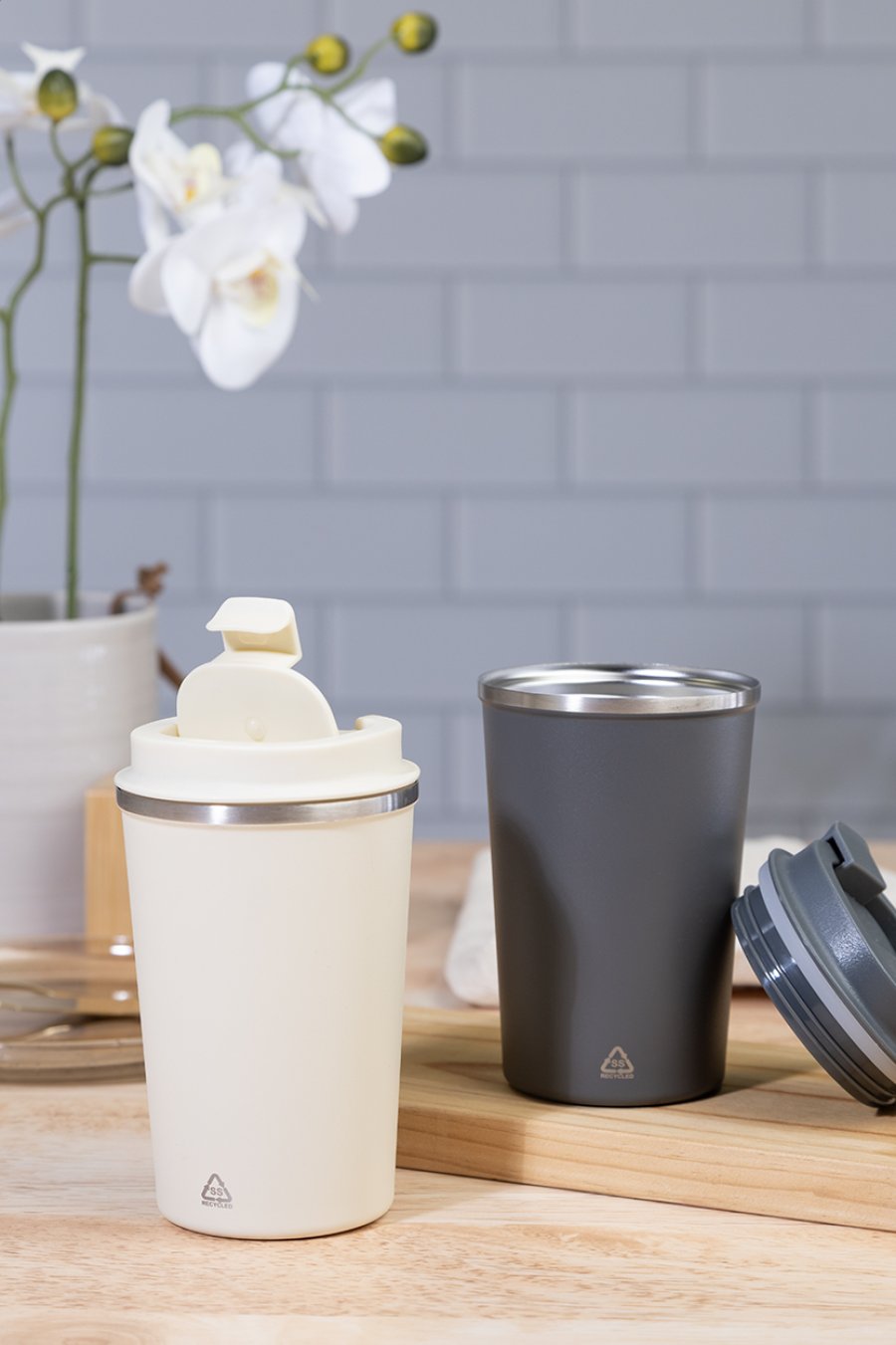 Dvoustěnný termo hrnek z recyklované nerezové oceli s víčkem na pití z PP. 350 ml.