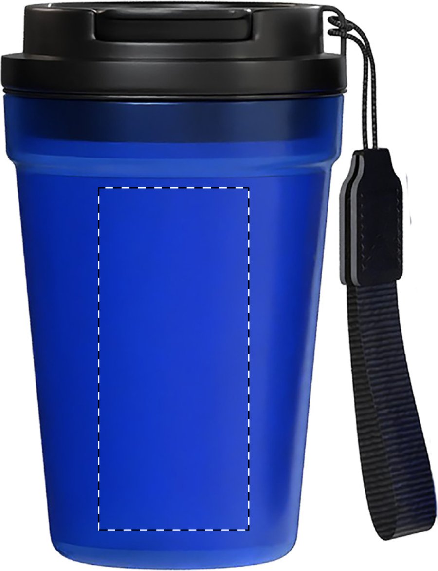 Jednostěnný cestovní kelímek z PP plastu s matnou povrchovou úpravou, víčkem na pití a poutkem z RPET polyesteru. 400 ml.