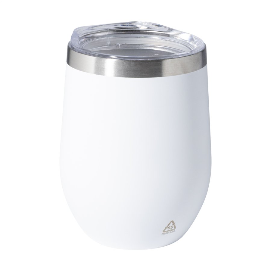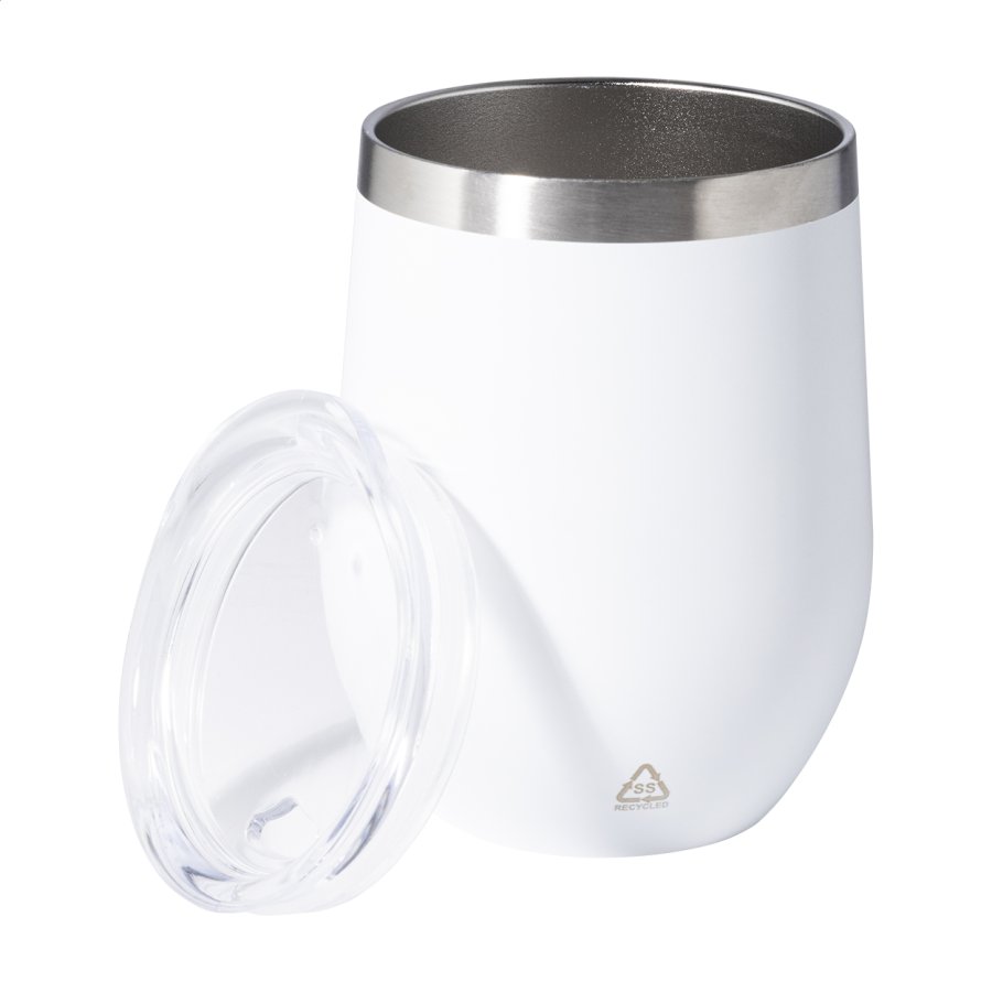 Dvoustěnný termo hrnek z recyklované nerezové oceli s plastovým víčkem na pití. 350 ml.