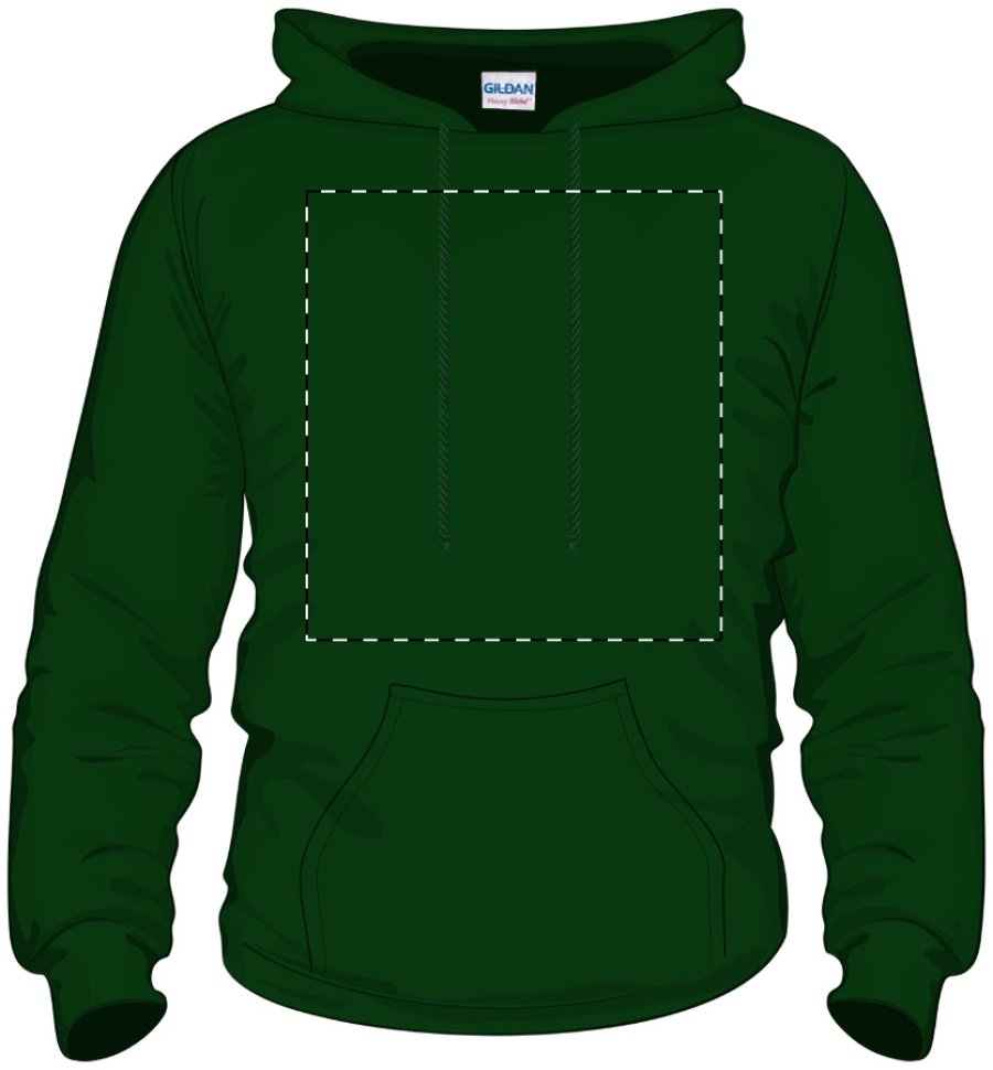 Mikina s kapucí, 80% bavlna a 20% polyester s přední kapsou. 285 g/m² (bílá 278 g/m²). Značka Gildan.