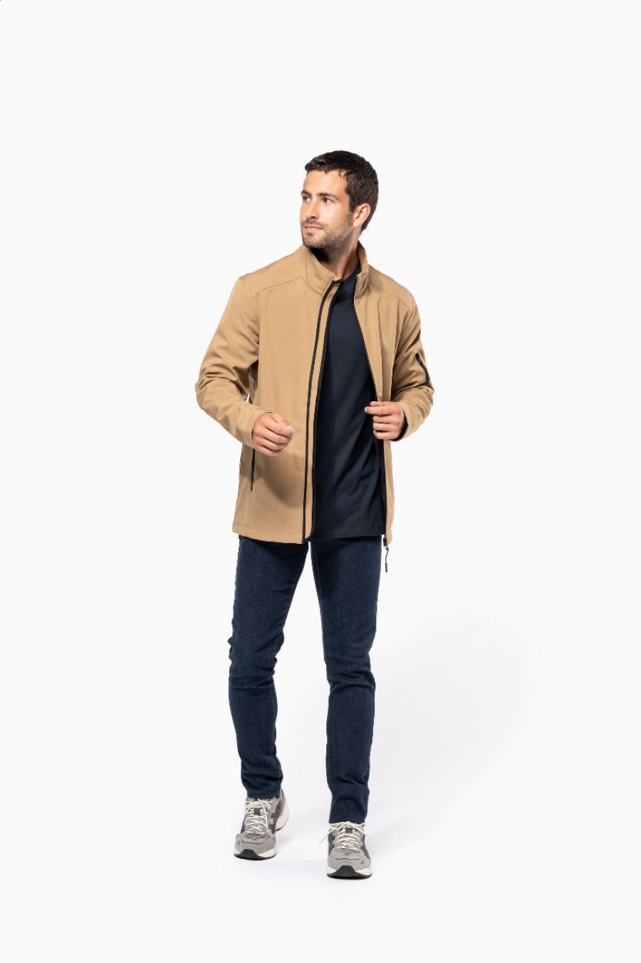 Třívrstvá, prodyšná, větru a vodě odolná softshellová bunda na zip s rukávy na zip a bočními kapsami. S prodyšnou střední vrstvou a vnitřní vrstvou z mikropolaru. Materiál: 95 % polyester a 5 % elastan, 300 g/m². Výrobek značky Kariban.
