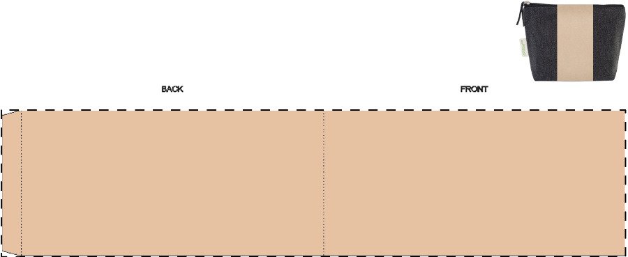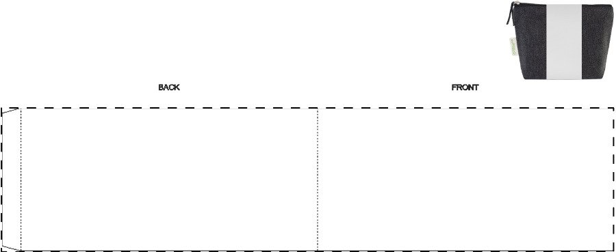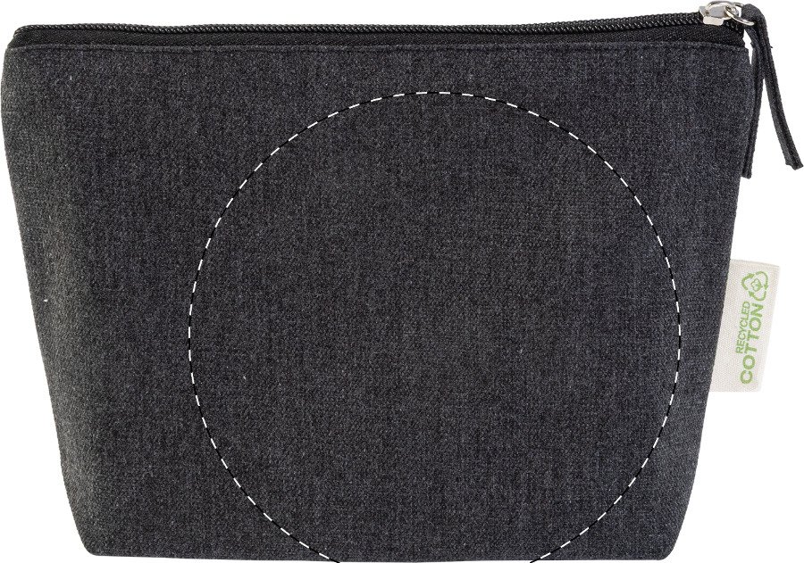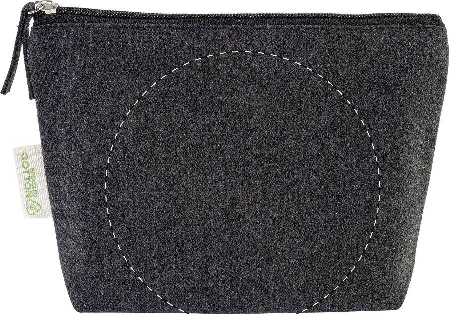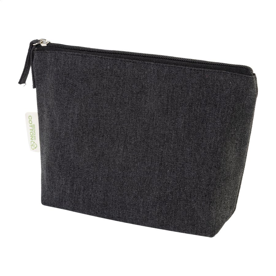 Kosmetická taštička na zip ze 70 % recyklované bavlny a 30 % RPET polyesteru, 280 g/m². S výraznou etiketou o recyklované bavlně.