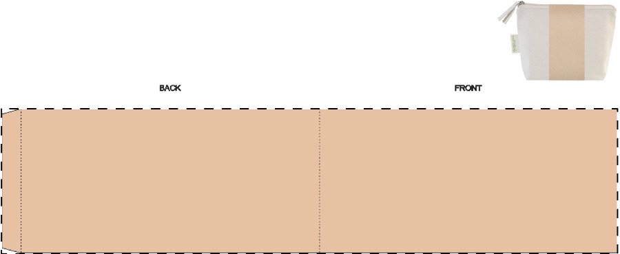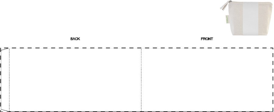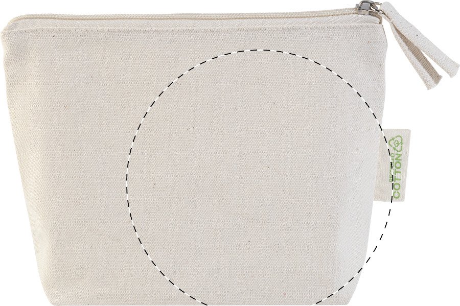 Kosmetická taštička na zip ze 70 % recyklované bavlny a 30 % RPET polyesteru, 280 g/m². S výraznou etiketou o recyklované bavlně.