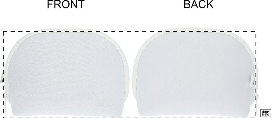 Kosmetická taštička na zip z RPET neoprenu vyrobená na zakázku. S výraznou RPET etiketou a sublimačním potiskem po celém obvodu, cena nezahrnuje tiskovou přípravu. Min. mn.: 50 ks.