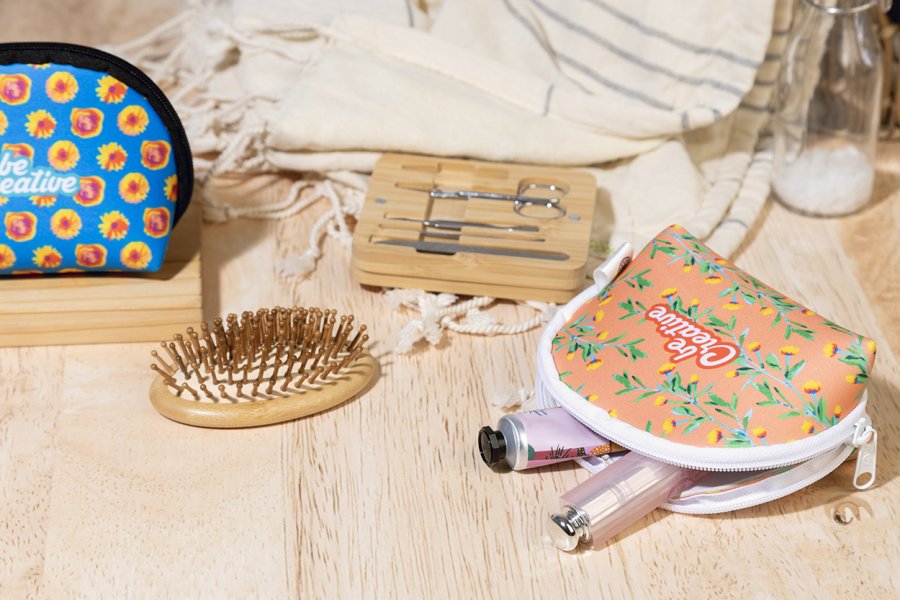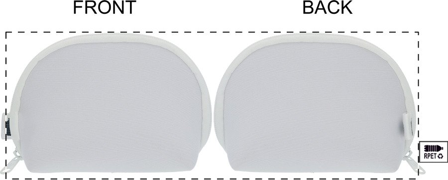Kosmetická taštička na zip z RPET neoprenu vyrobená na zakázku. S výraznou RPET etiketou a sublimačním potiskem po celém obvodu, cena nezahrnuje tiskovou přípravu. Min. mn.: 50 ks.
