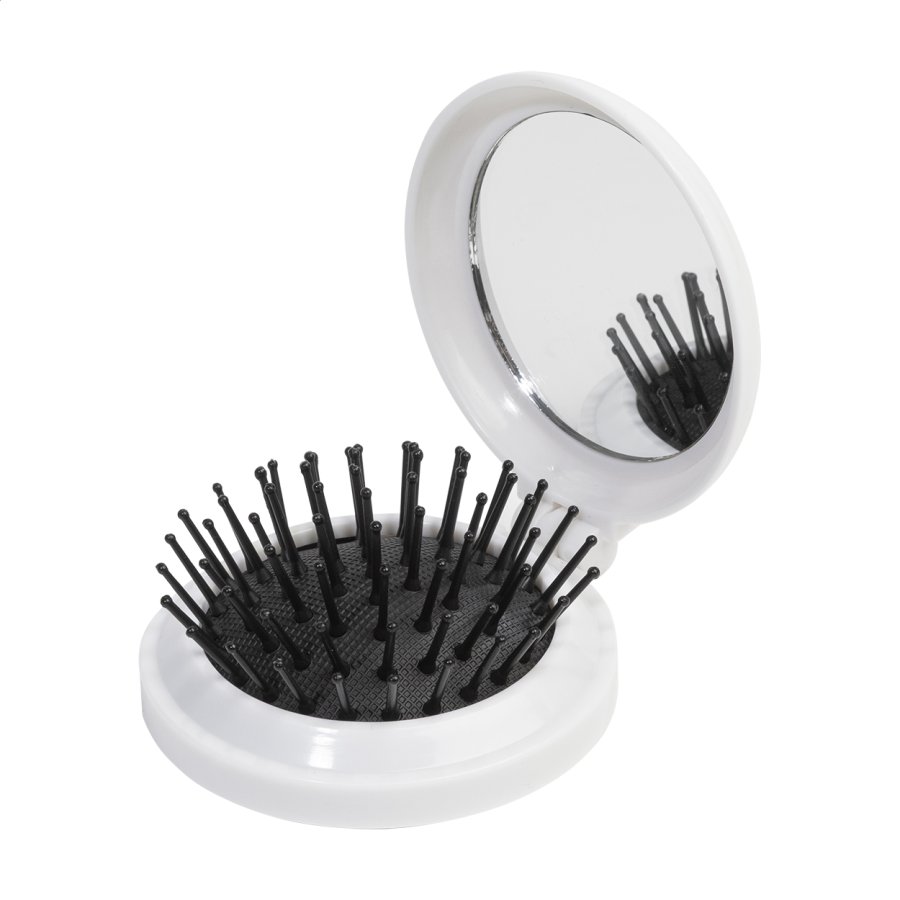 Skládací kartáč na vlasy z recyklovaného ABS s kapesním zrcátkem.