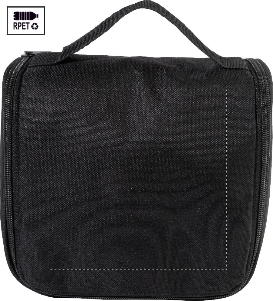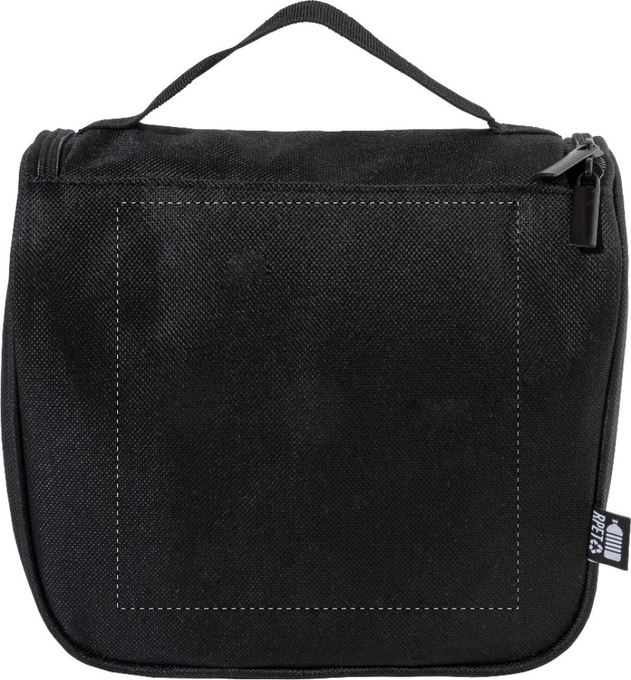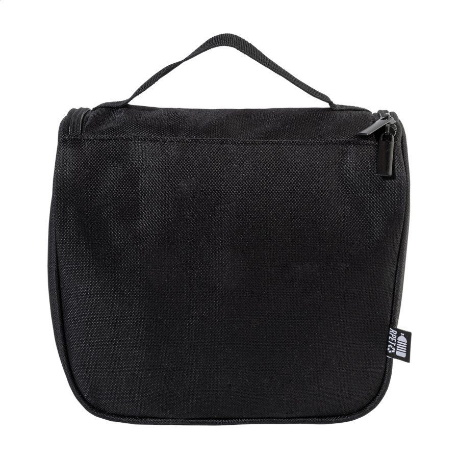 Závěsná kosmetická taška z RPET s vnitřními přihrádkami na zip a síťovanými kapsami. 600D RPET polyester s charakteristickým štítkem RPET.