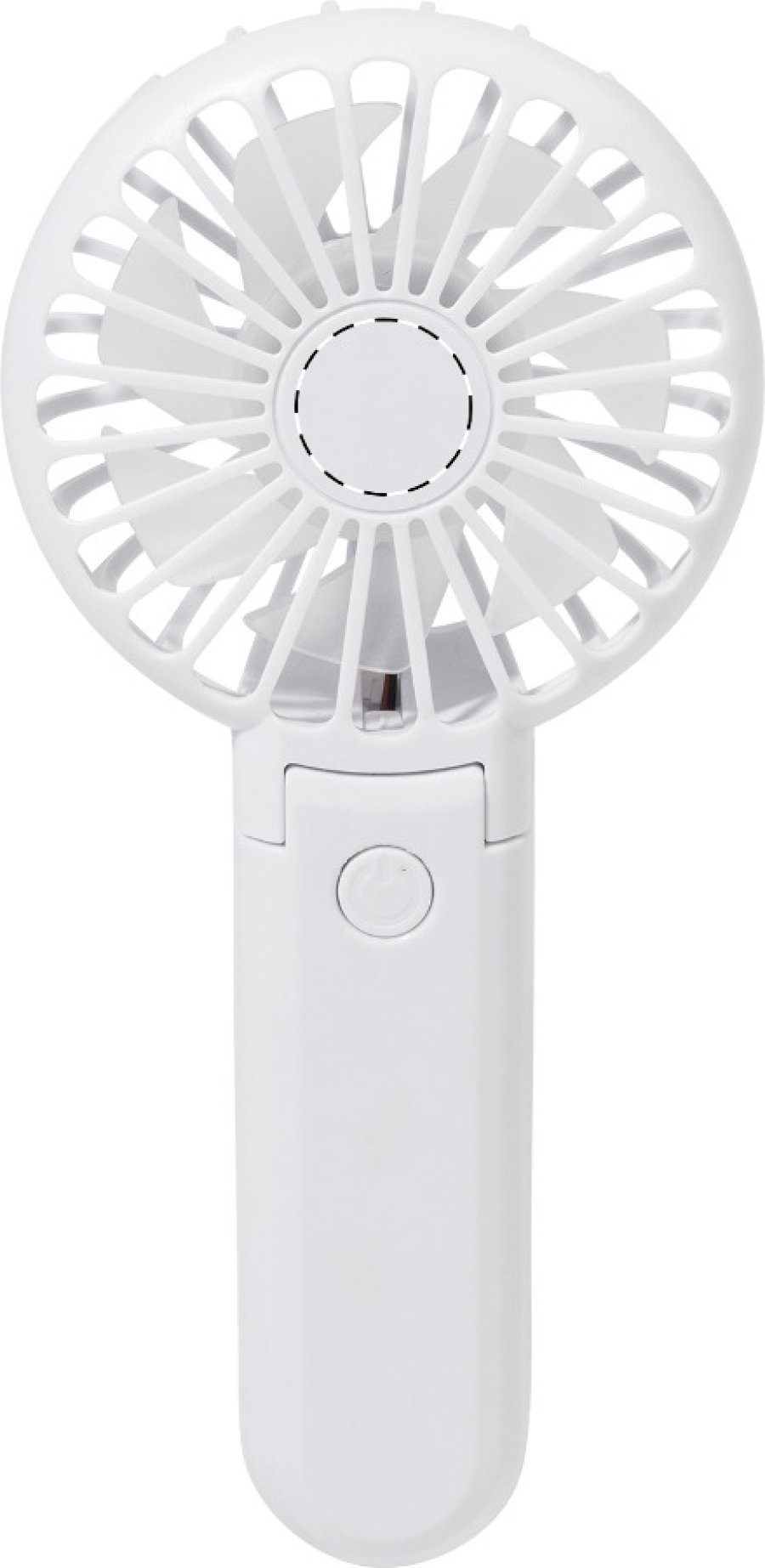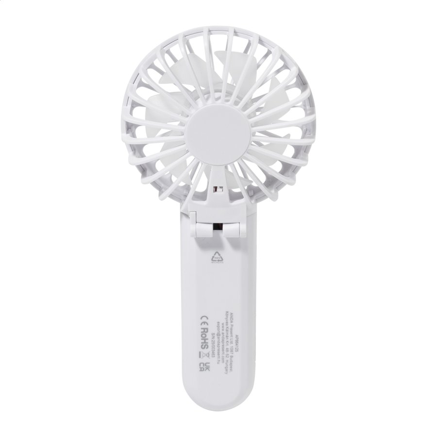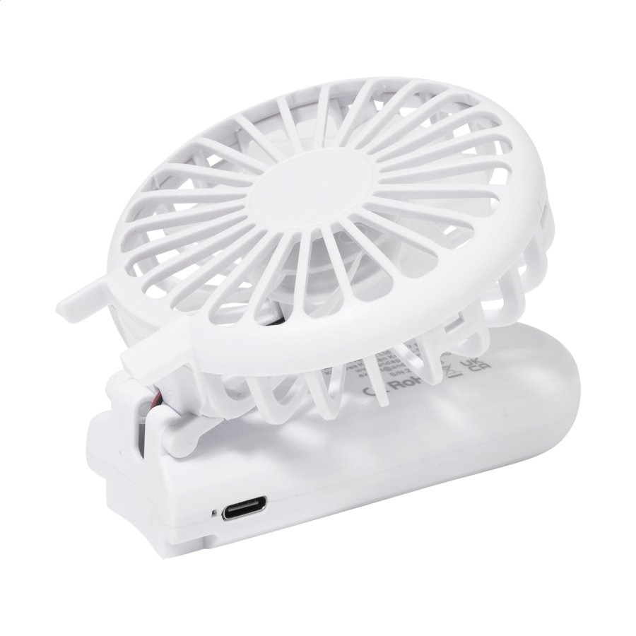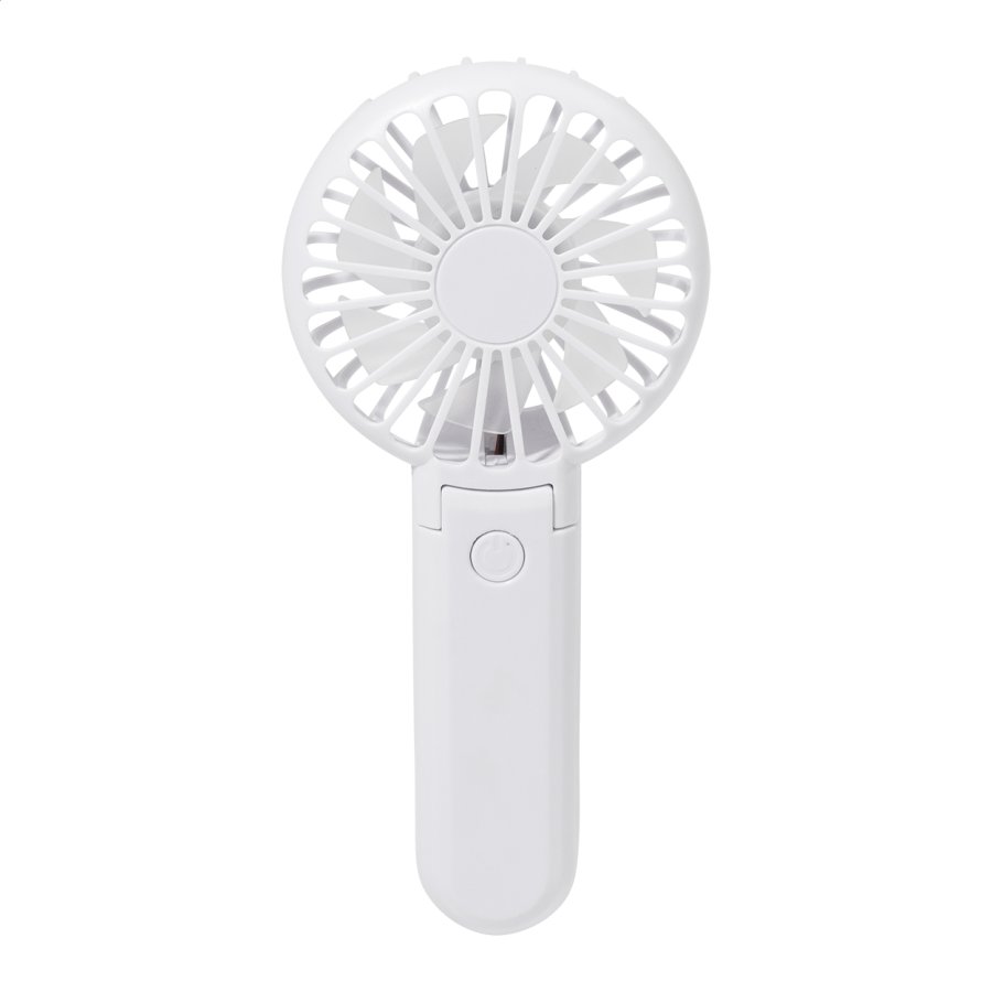 Elektrický ruční větráček z recyklovaného ABS plastu s vestavěnou dobíjecí baterií přes USB (400 mAh). S nastavitelným úhlem hlavy a 3 rychlostmi. Včetně USB kabelu pro nabíjení.