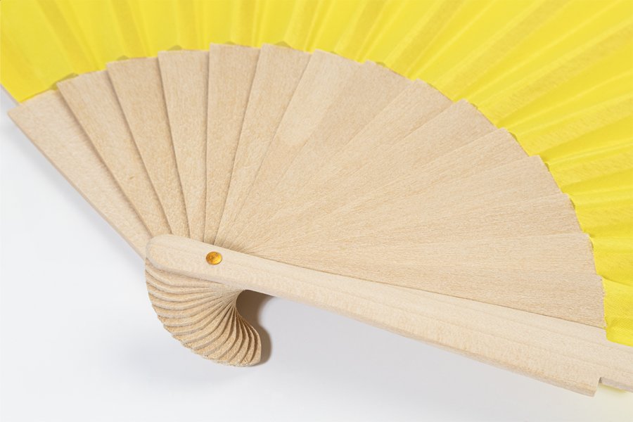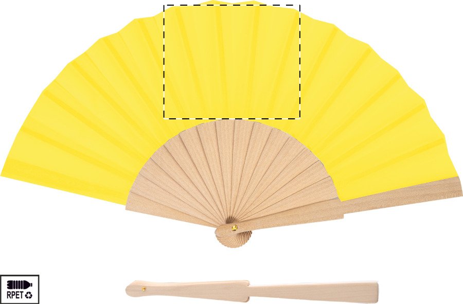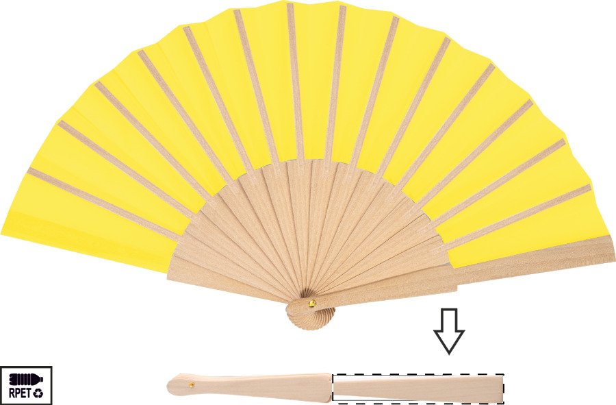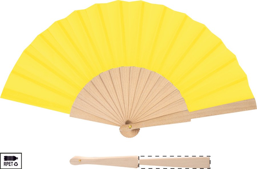 Vějíř z RPET polyesteru s dřevěnými žebry.