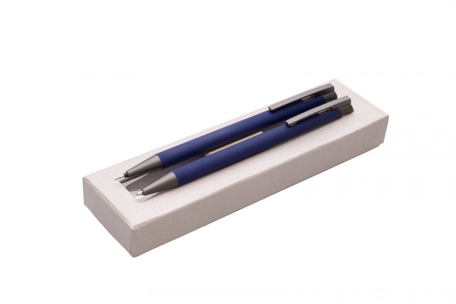 Dárková sada modré propisky a mikrotužky s pogumovaným povrchem a šedými doplňky v luxusním dárkovém pouzdru s průhledným okénkem.