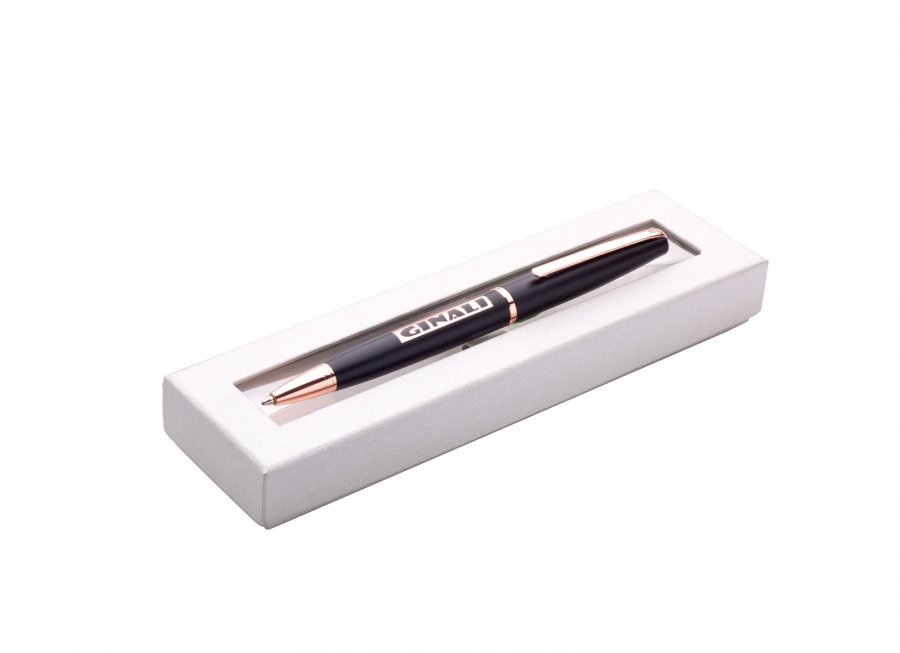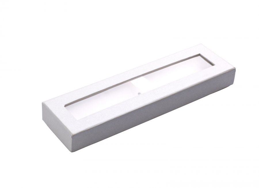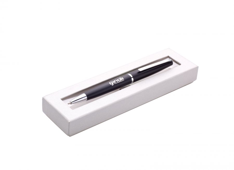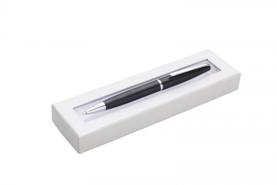 kovová propiska v dárkové krabičce s průhledným okénkem.