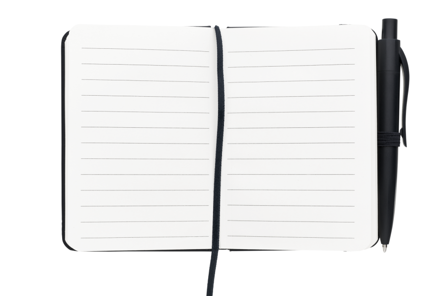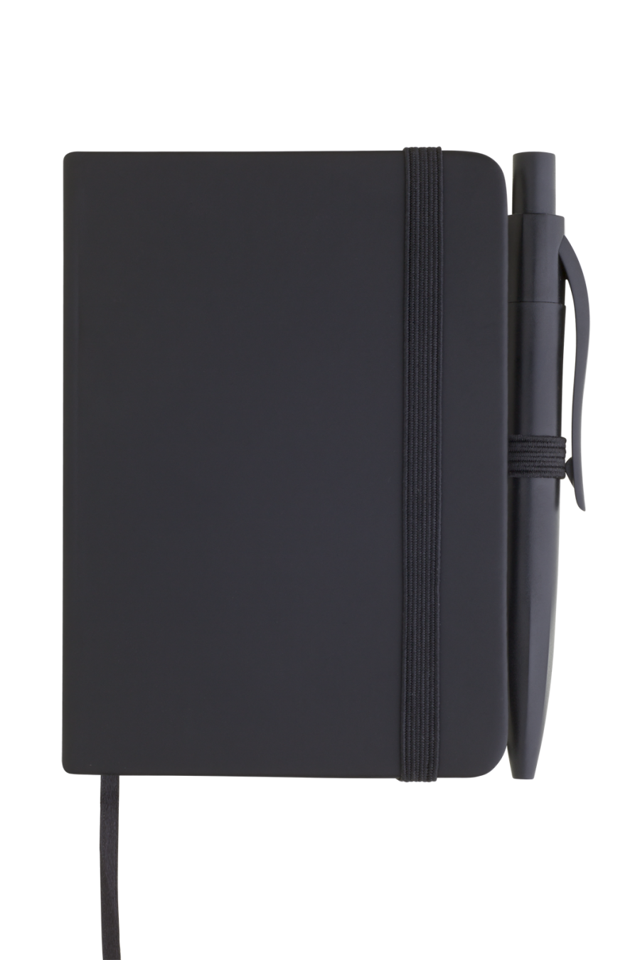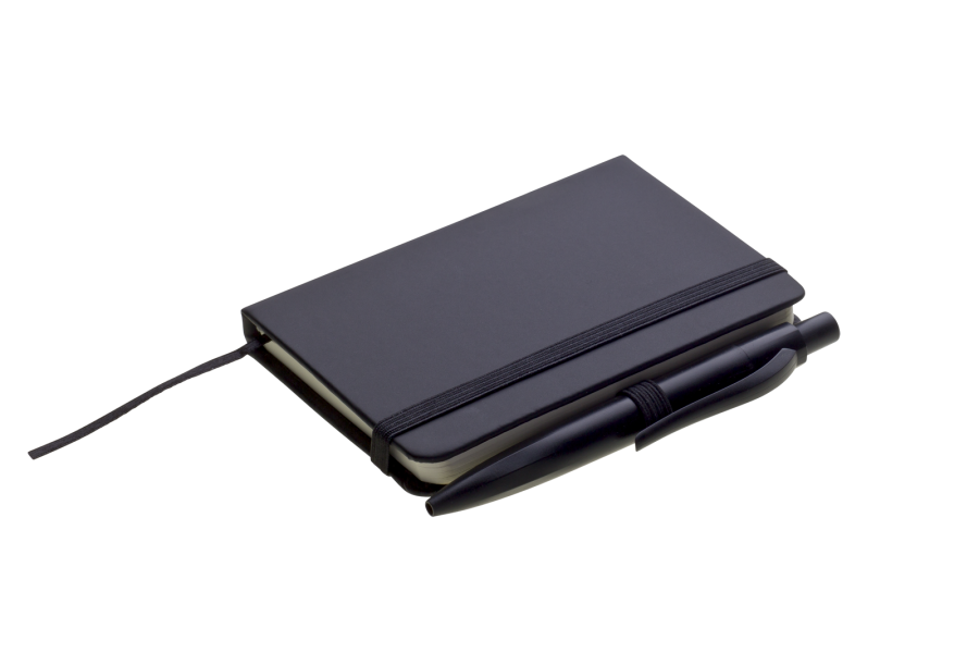Zápisník A7 v černých deskách z PU materiálu má 80 linkovaných listů. Blok má uzavírací gumičku, poutko na propisku a textilní záložku v barvě desekSoučástí bloku je propiska připevněná na přinýtovaném poutku.