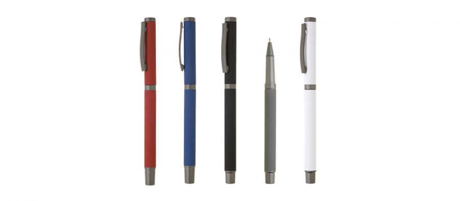 Elegantní kovový roller RIFLO SOFT v černé barvě s tmavě šedými doplňky a pogumovaným povrchem. Náplň v rolleru píše modře.
