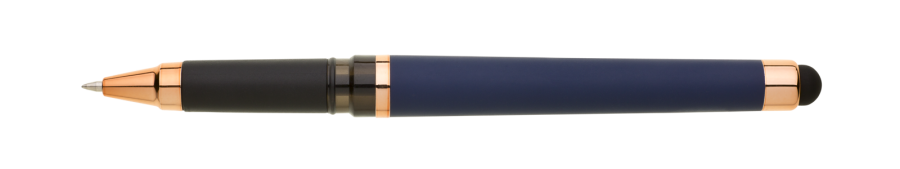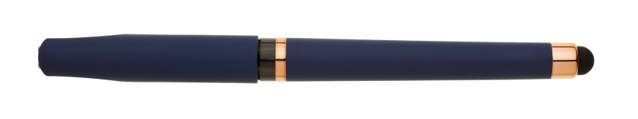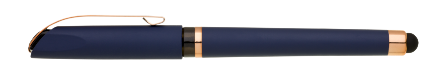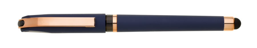 Gelová propiska s s víčkem a touch koncem, soft povrch a doplňky v růžovo-zlaté barvě. Náplň gelová velkokapacitní modře píšící.