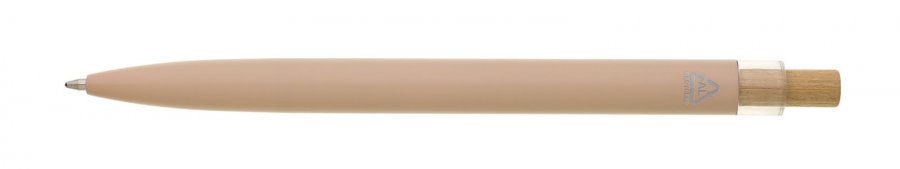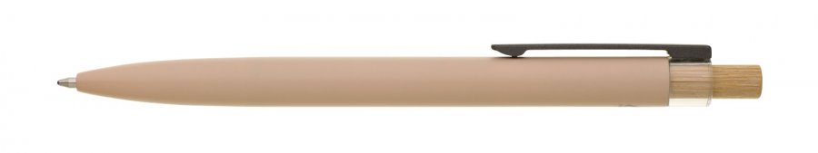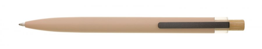 Béžová designová kovová propiska z recyklovaného hliníku. Tmavý kovový klip je uchycen v ozdobné transparentní koncovce, doplněné bambusovým cvakátkem. Náplň velkoobsahová, modře píšící. Kolekce SAVE THE NATURE.