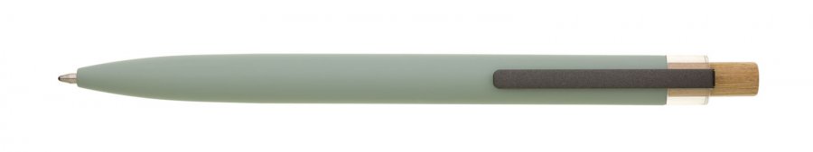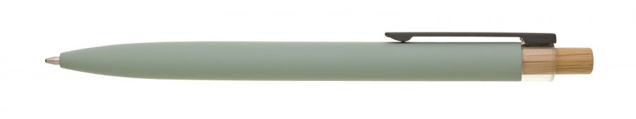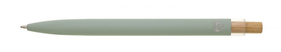 Zelená designová kovová propiska z recyklovaného hliníku. Tmavý kovový klip je uchycen v ozdobné transparentní koncovce, doplněné bambusovým cvakátkem. Náplň velkoobsahová, modře píšící. Kolekce SAVE THE NATURE.