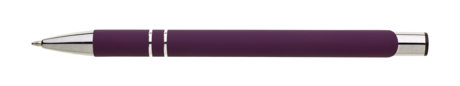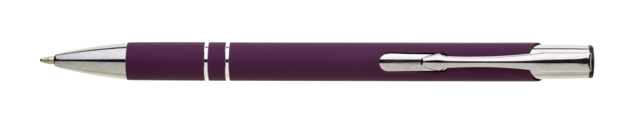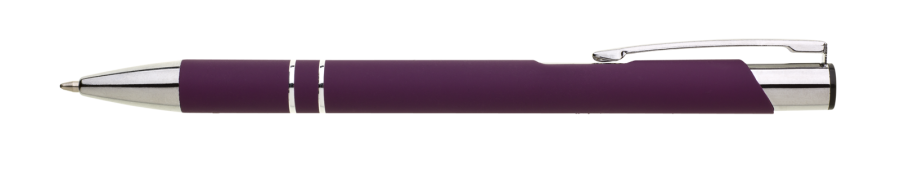 Hliníková propiska se stříbrnými doplňky a měkkým pogumovaným soft povrchem ve fialové barvě. Modře píšící.