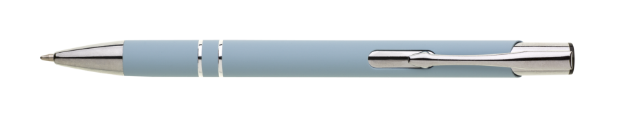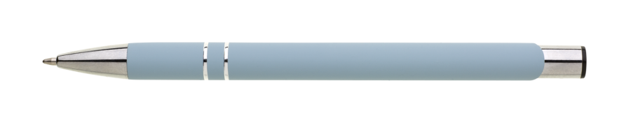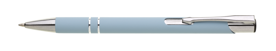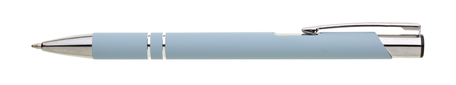 Hliníková propiska se stříbrnými doplňky a měkkým pogumovaným soft povrchemve ve světle modré barvě. Modře píšící.