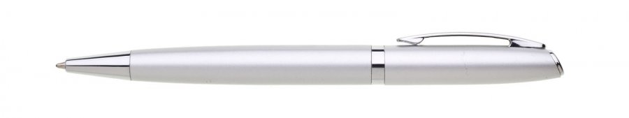 Hliníková propiska TORICO s otočným mechanismem v barvě matně stříbrné a lesklými stříbrnými doplňky. Náplň velkoobsahová, modře píšící.