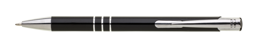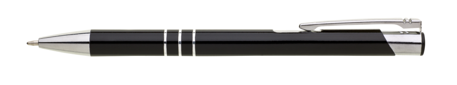 TRIALI hliníková reklamní tužka. Lesklé černé tělo se třemi stříbrnými proužky a chromovými doplňky.Velkoobsahová modrá náplň.