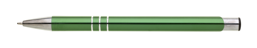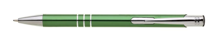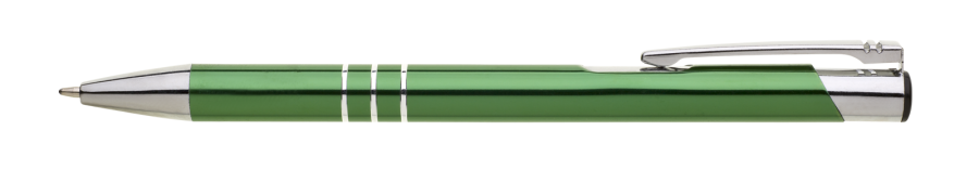 TRIALI hliníková reklamní tužka. Lesklé zelené tělo se třemi stříbrnými proužky a chromovými doplňky.