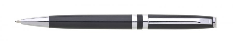 Varianta klasické propisky černé tělo je zdobené dvěma chromovými kroužky. Otočný mechanismus, náplň modře píšící.