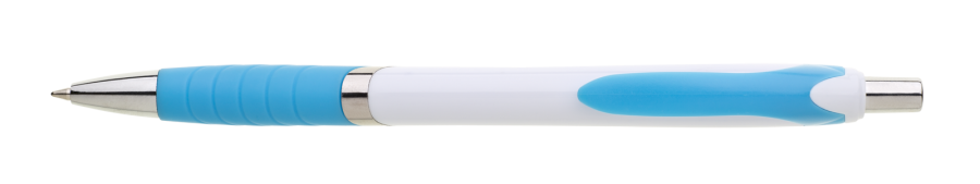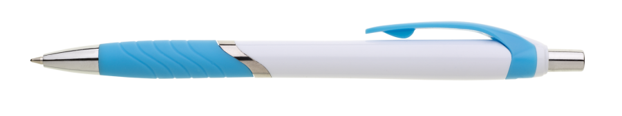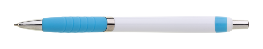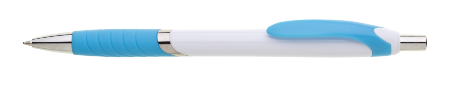 Plastová propiska s bílým tělem tyrkysovým úchopem a klipem a stříbrnými doplňky.