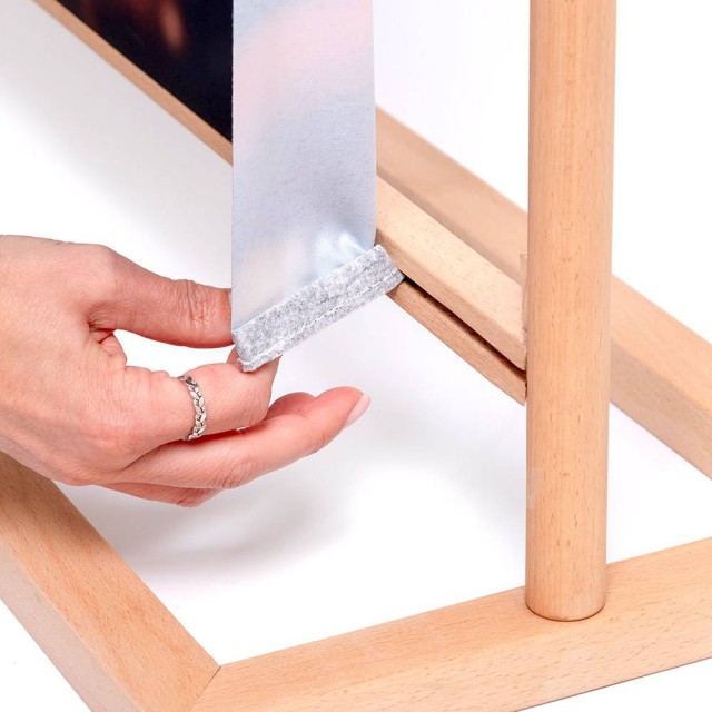 Dřevěný banerový stojan Rustic je dokonalou kombinací odolnosti a stylu. Je vyroben z tvrdého bukového dřeva, které je mimořádně pevné a odolné. Tento stojan je ideálním řešením pro jakoukoli propagaci v interiéru. Motiv kdykoliv snadno vyměníte, navíc vaše stopa bude ekologická, neboť polyesterové lemování (100% PES) na horní a spodní straně baneru je zcela bez obsahu PVC. Ať už se jedná o branding, uvítací zprávy nebo propagační akce, je to ideální stojan, který využijete na akcích, ve veřejných prostorách nebo v pohostinství.