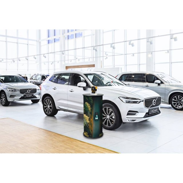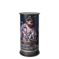 Má elegantní kulatou černou desku s drážkou pro upevnění panelu, na nějž jednoduše připevníte grafiku pomocí suchého zipu. Dřevěná deska je důmyslně zabalena v polstrované tašce s pevným úchytem, který zajišťuje pohodlnou přepravu. Plastový panel s tiskem je pečlivě srolován a zabalen v tašce s tubusem a díky rukojeti ho snadno a bezpečně přemístíte z jedné akce na další. Skvělý promo stolek na výstavy a akce. Maximální doporučená nosnost horní desky demostánku - 45kg