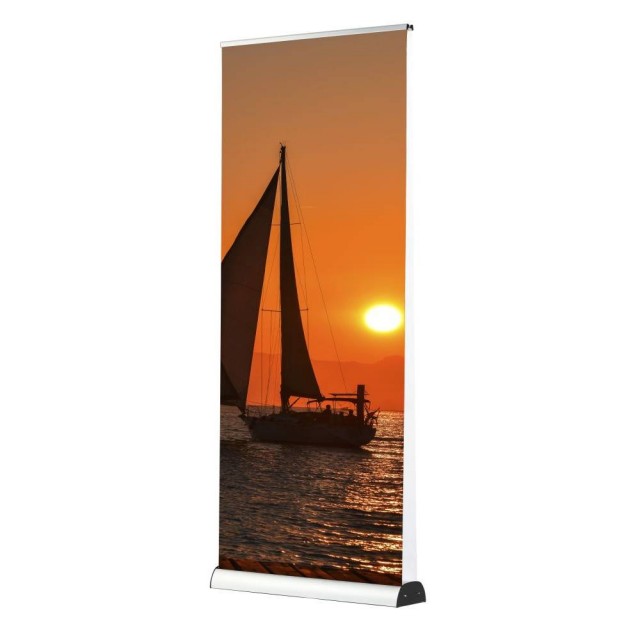 Oboustranný Roll-up Twin s minimalistckým designem. Stabilní základna nepotřebuje další nohy. Tyč je mezi dvěma potisky prakticky neviditelná - ideální pro přitáhnutí maximální pozornosti z více stran.